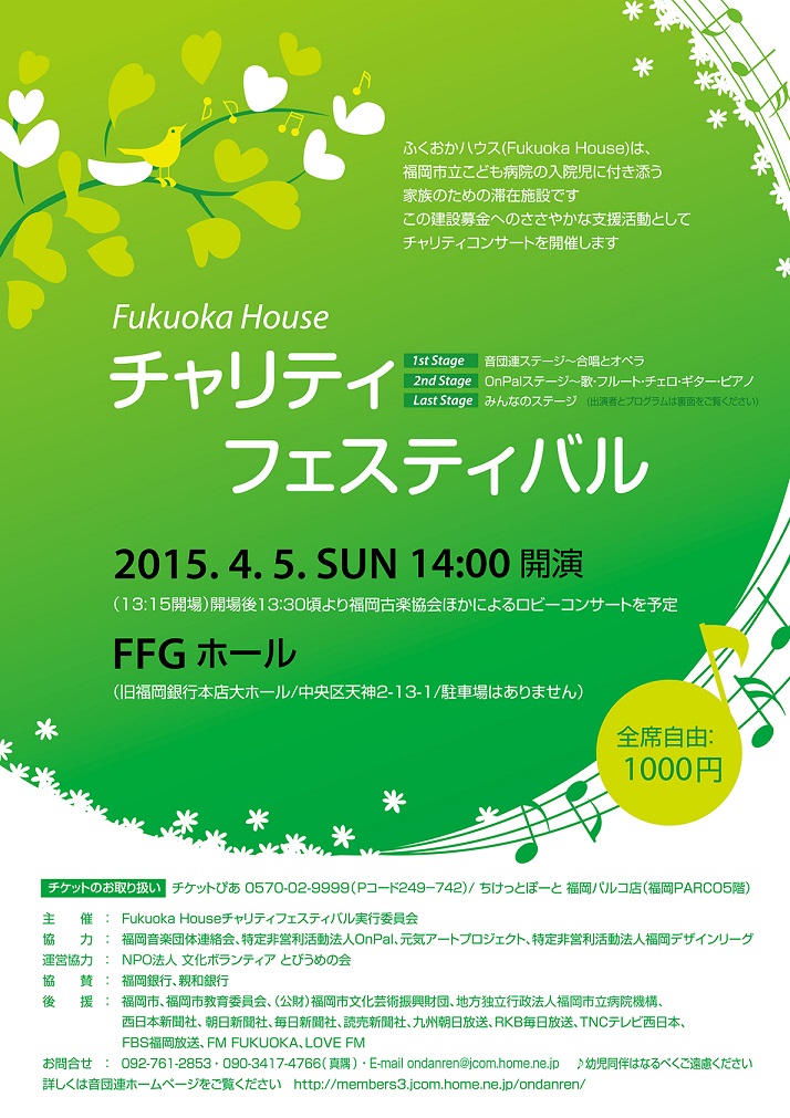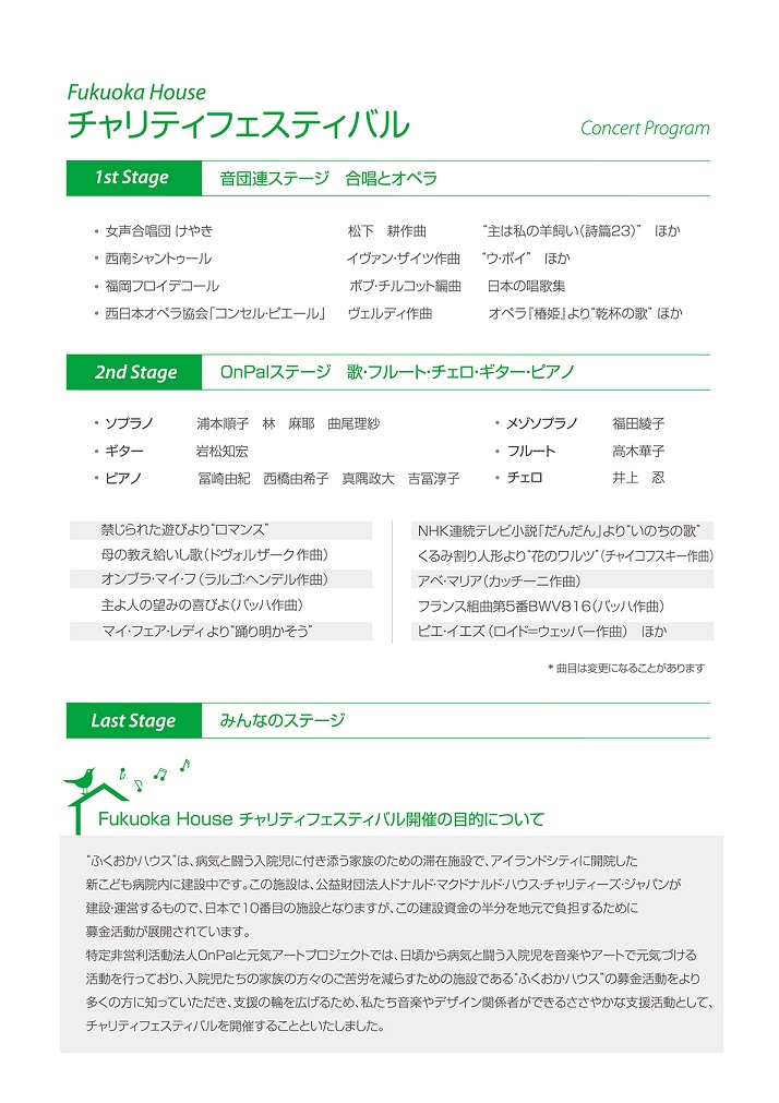 ♪主催は、福岡音楽団体連絡会、特定非営利活動法人OnPal、元気アートプロジェクト、特定非営利活動法人福岡デザインリーグの4団体のメンバーで構成する“Fukuoka Houseチャリティフェスティバル実行委員会”で、 コンサートだけでなく、音楽家とデザイナーがコラボレーションする音楽とデザインの世界を展開します。